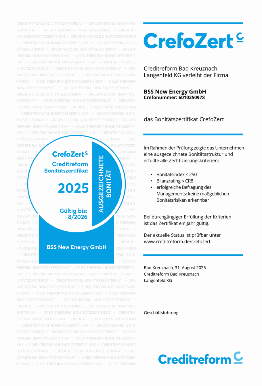 Die BSS New Energy GmbH ist für eine ausgezeichnete Bonität zertifiziert.